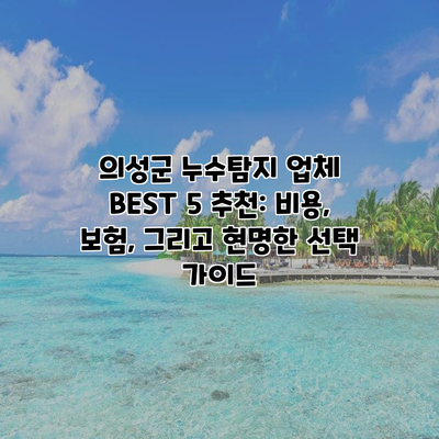 다음은 의성군에서 높은 평가를 받고 있는 누수탐지 업체 5곳이에요. 각 업체의 특징과 장단점을 비교하여, 여러분의 상황에 맞는 업체를 선택하세요. 단, 여기서 소개하는 업체들은 정보제공 목적으로만 언급되며, 특정 업체를 지지하는 것은 아니라는 점을 알려드립니다. 직접 연락하여 견적 및 상담을 받아보시는 것을 추천드려요.